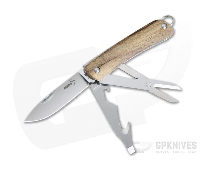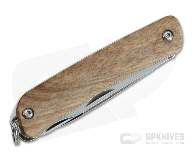 Handle:Â The Mini Tech-Tool 4 has a simple, slip joint construction with stainless liners and back springs supporting smooth, contoured, Zebra Wood handles that provide a striking look and great in-hand feel. Zebra Wood is an exotic hard wood used in fine wood working such as musical instruments and furniture and makes a great knife handle due to its stability and weather resistance. The back spring offers secure use without a half-stop. Boker’s Mini Tech-Tool comes with a stainless steel split ring for key chain carry.