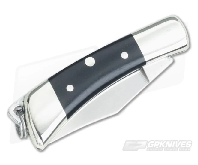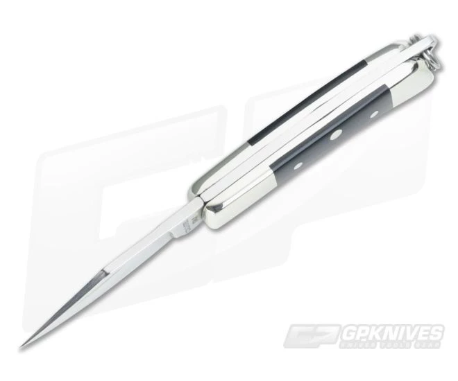 The Handle:Â Just enough curved handle here for two fingers and a thumb. The grip is actually quite nice. Wonderful black micarta handle scales are pinned between nickel silver bolsters. Traditional, handsome styling.Â
