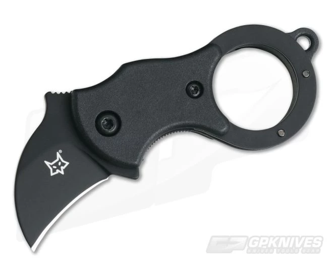 The Fox Knives Mini-Ka is a simple little key ring Karambit that offers a solid cutting tool that weighs about as much as three keys! The compact hawkbill blade is perfect for box opening and other daily tasks. This version comes with a black Cerakote blade and Black FRN handles.
