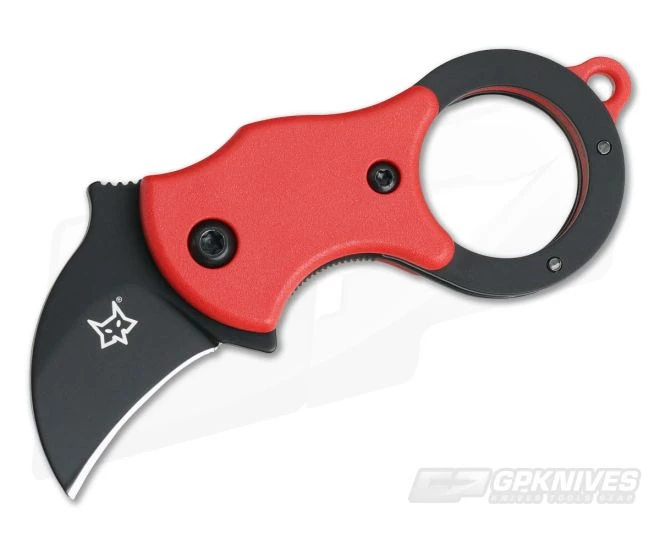 The Fox Knives Mini-Ka is a simple little key ring Karambit that offers a solid cutting tool that weighs about as much as three keys! The compact hawkbill blade is perfect for box opening and other daily tasks. This version comes with a black Cerakote blade and Red FRN handles.