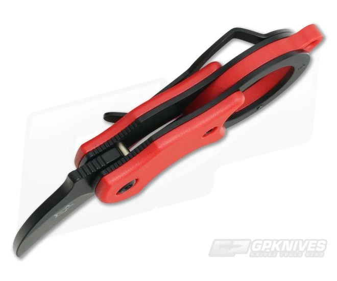 Handle:Â Simple, robust construction is created with stainless steel liners which support Red FRN handle scales. The steel liner for the integral lock as well as the pocket clip and karambit ring while the FRN forms a small ring for key ring attachment. Both the liners and pocket clip are coated black to match the blade.