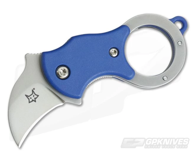 The Fox Knives Mini-Ka is a simple little key ring Karambit that offers a solid cutting tool that weighs about as much as three keys! The compact hawkbill blade is perfect for box opening and other daily tasks. This version comes with a sandblasted blade and blue FRN handles.