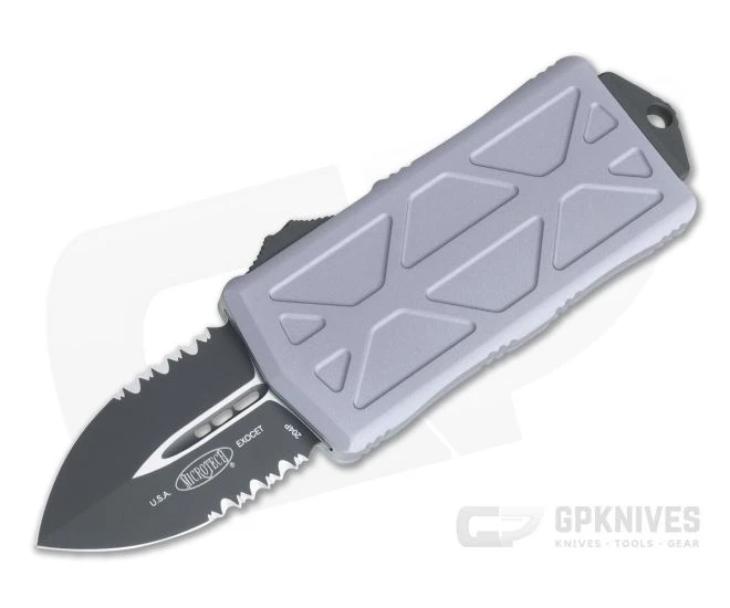 The California Legal Exocet is a dual action mini out the front automatic knife from Microtech that’s one of the most friendly for everyday carry. The diminutive size is perfect for watch pocket or even key ring carry. Not only is it perfect for everyday slicing, but it doubles as a handy money clip. This version has a gray anodized, contoured aluminum handle and a black coated, partially serrated double edge CTS-204P stainless blade.