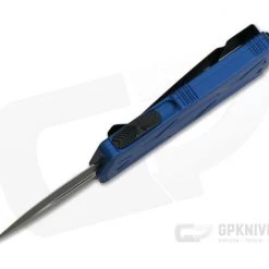 The California Legal Exocet is a dual action mini out the front automatic knife from Microtech that’s one of the most friendly for everyday carry. The diminutive size is perfect for watch pocket or even key ring carry. Not only is it perfect for everyday slicing, but it doubles as a handy money clip. This version has a Blue contoured handle and a black coated plain Double Edge premium CTS-204P stainless blade.