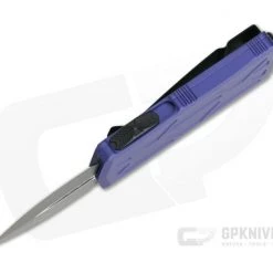 The California Legal Exocet is a dual action mini out the front automatic knife from Microtech that’s one of the most friendly for everyday carry. The diminutive size is perfect for watch pocket or even key ring carry. Not only is it perfect for everyday slicing, but it doubles as a handy money clip. This version has a Purple contoured handle and a black coated plain Double Edge premium CTS-204P stainless blade.