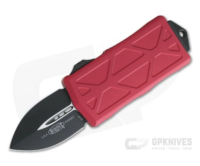 The California Legal Exocet is a dual action mini out the front automatic knife from Microtech that’s one of the most friendly for everyday carry. The diminutive size is perfect for watch pocket or even key ring carry. Not only is it perfect for everyday slicing, but it doubles as a handy money clip. This version has a red anodized, contoured aluminum handle and a black coated plain Double Edge premium CTS-204P stainless blade.