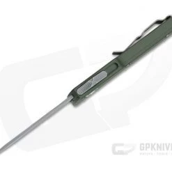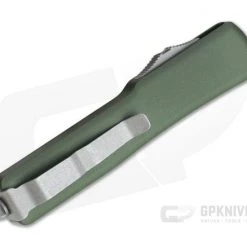 Handle: Smooth, Green coated 6061-T6 aluminum has improved rounded edges creating not only a comfortable feel in-hand but a smooth transition in and out of your pocket. As the UTX-70 is much smaller and thinner they have left off the jimping for a cleaner look. This is a gentleman’s OTF automatic. The contoured handle design is easy on the hands and eyes. The handle’s construction is completed with Microtech’s proprietary Apocalyptic hardware, glass breaker end and pocket clip with individual serial number/date of production.Â