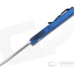 The UTX-70 (30% smaller than the standard Ultratech) is a dual action mini out the front automatic knife from Microtech that’s one of the most friendly for everyday carry. The diminutive size is perfect for watch pocket or even key ring carry. This version has Blue contoured aluminum handles and a plain, black Cerakote coated, CTS-204P Tanto blade.
