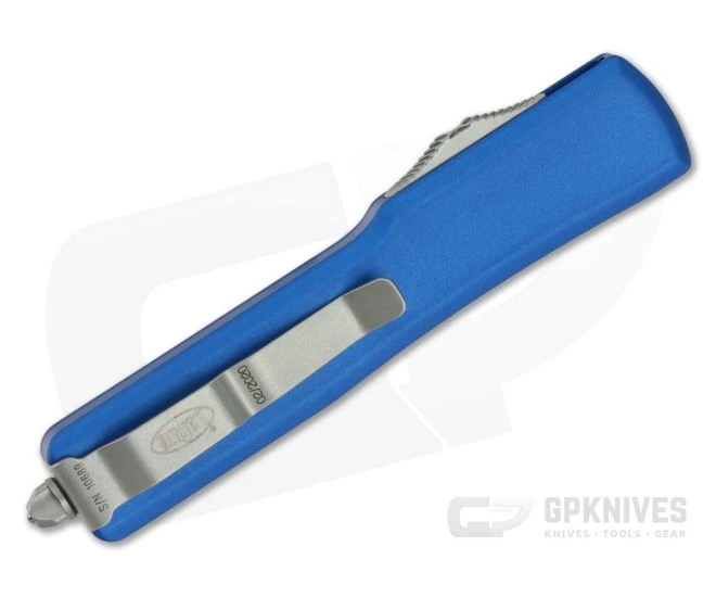 Handle:Â Smooth, Blue hard anodized 6061-T6 aluminum handles have improved rounded edges creating not only a comfortable feel in-hand but a smooth transition in and out of your pocket. As the UTX-70 is much smaller and thinner they have left off the jimping for a cleaner look. This is a gentleman’s OTF automatic. The contoured handle design is easy on the hands and eyes. The handle’s construction is completed with Microtech’s proprietary hardware, glass breaker end and blasted pocket clip with individual serial number/date of production.