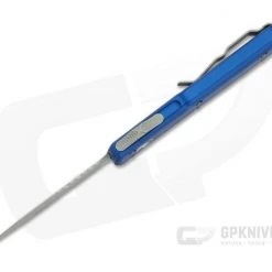 The UTX-70 (15% smaller than the UTX-85) is a dual action mini out the front automatic knife from Microtech that’s one of the most friendly for everyday carry. The diminutive size is perfect for watch pocket or even key ring carry. This version has Blue contoured handles and a partially serrated Stonewashed finished, Double Edge M390 blade.