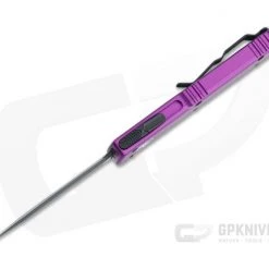 The Microtech UTX-70 (15% smaller than the UTX-85) is a miniature double action out-the-front automatic knife. The smallest in the Ultratech line, the UTX-70 is an ultra friendly size for everyday carry, fitting perfectly in a watch or shirt pocket. This version has a violet anodized aluminum handle and two-tone black Cerakote coated, double edge M390 blade.