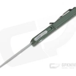 The UTX-70 (15% smaller than the UTX-85) is a dual action mini out the front automatic knife from Microtech that’s one of the most friendly for everyday carry. The diminutive size is perfect for watch pocket or even key ring carry. This version has OD Green contoured handles and a plain Stonewashed finished, Double Edge CTS-XHP blade.