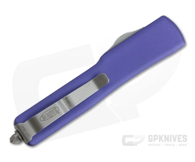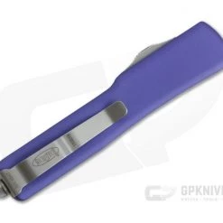 Handle:Â Smooth, Purple anodized 6061-T6 aluminum has improved rounded edges creating not only a comfortable feel in-hand but a smooth transition in and out of your pocket. As the UTX-70 is much smaller and thinner they have left off the jimping for a cleaner look. This is a gentleman’s OTF automatic. The contoured handle design is easy on the hands and eyes. The handle’s construction is completed with Microtech’s proprietary hardware, glass breaker end and blasted pocket clip with individual serial number/date of production.