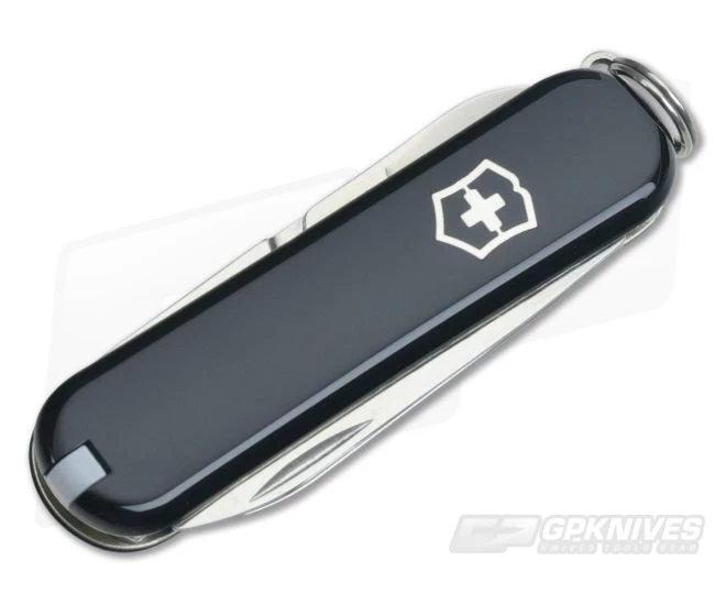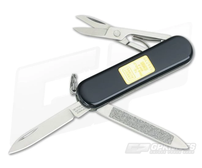 Victorinox Classic Swiss Army Knife with Swiss stainless steel components. Black celluloid handle inlaid with a one gram gold ingot issued by the Union Bank of Switzerland. Includes stainless steel lanyard ring.