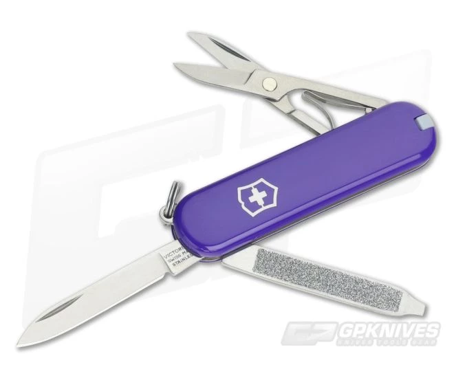 Victorinox Classic SD Swiss Army Knife with Swiss stainless steel components with purple celluloid handle. Includes stainless steel lanyard ring.
