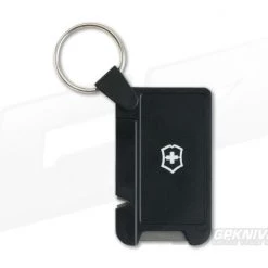 Victorinox Tinker Swiss Army Knife with Swiss stainless steel components and red celluloid handle. Includes stainless steel lanyard ring. Includes a carbide sharpener with split ring for key chain attachment.